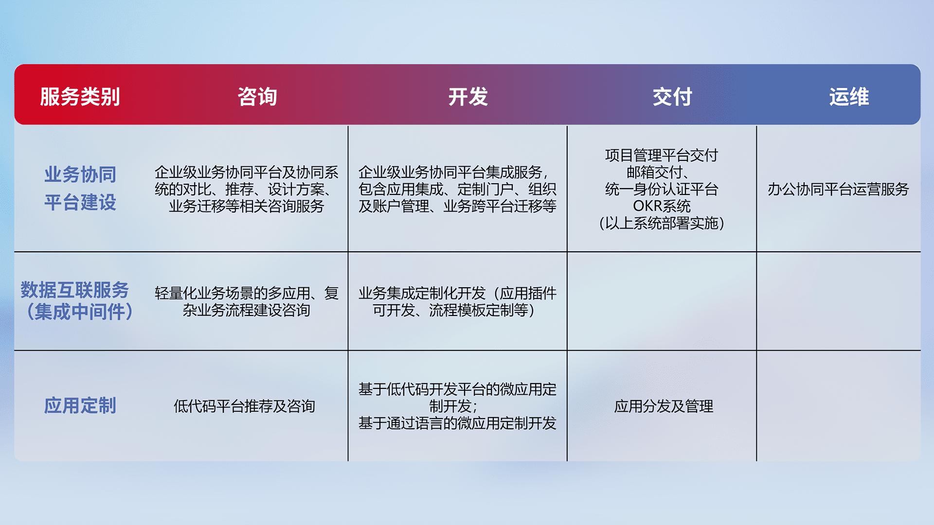 针对钉钉、、企微、、、IDaas等平台级产品提供产品的规划、、方案、、交付、、定制化开发等服务,,,实现如统一协同办公、、、、智能客户服务、、、混合会议管理、、、、智能数据查询、、、、等业务场景,,,实现数字化转型。。