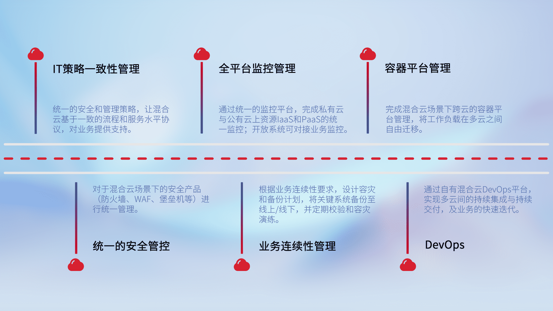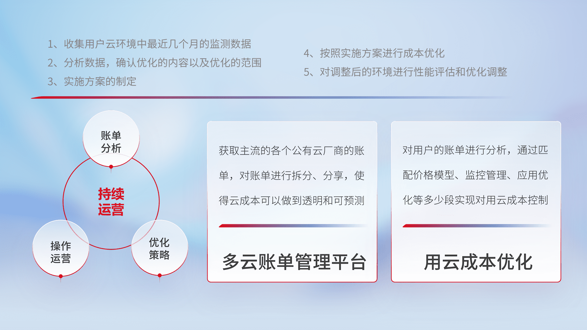 通过多云纳管,,,,以统一的资源数据模型把客户的云资源进行抽象和封装,,,进而实现对多云资源的统一操作,,,,保障云资源管理的可靠性、、、稳定性与可用性。。量身定制化运维内容,,,,配置、、、、开发运维、、、、补丁管理、、备份、、、监控、、、、认证和访问管理、、、审计和日常巡检等,,,保障在用云过程中的可靠度,,,稳定度以及高可用率。。。