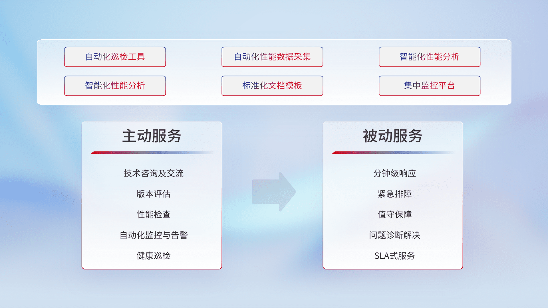 智能化工具和标准化文档,,,,保障服务质量,,提供主动服务(包含技术咨询、、、、版本评估、、、性能检查、、自动化监控与告警、、健康巡检)和被动服务包含(分钟级响应、、、、紧急排障、、值守保障、、、问题诊断解决、、、SLA服务)。。。。